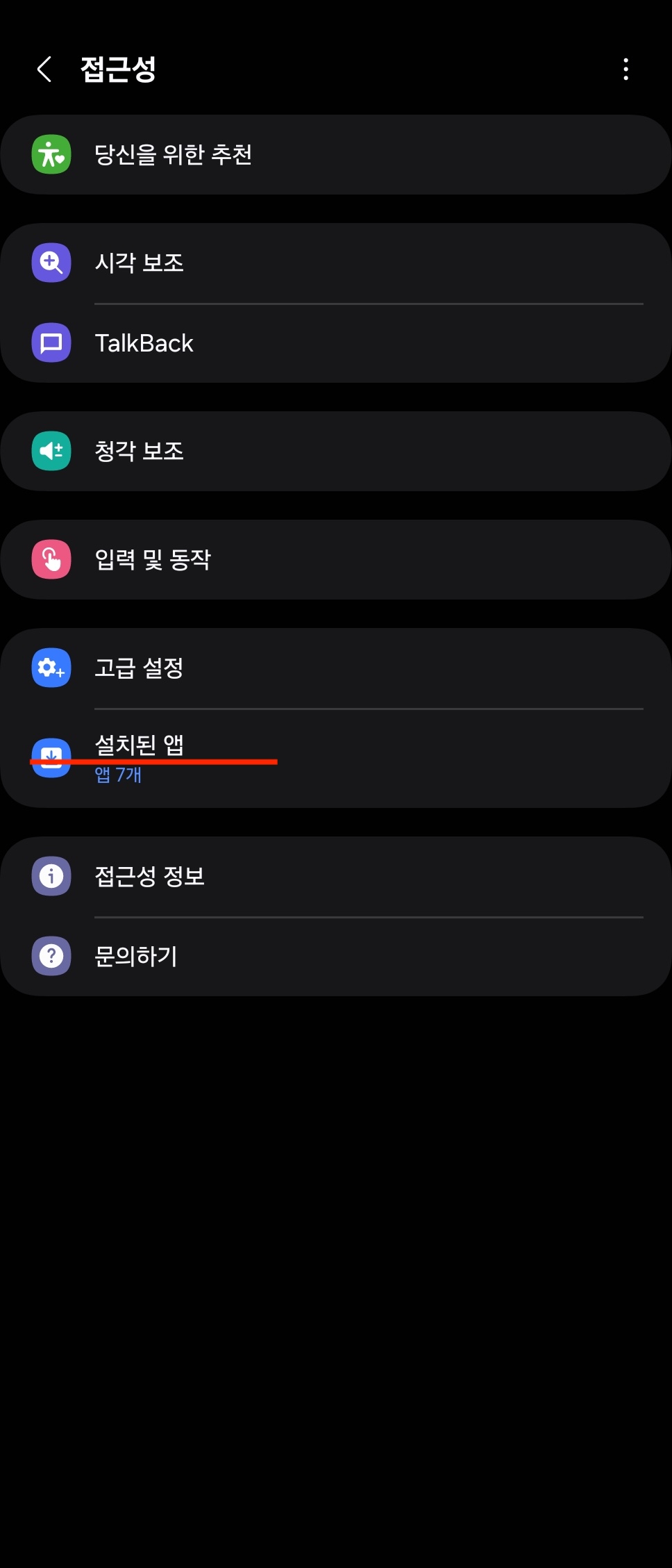 접근성 화면에서 아래 설치된 앱 클릭